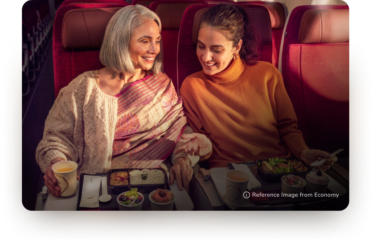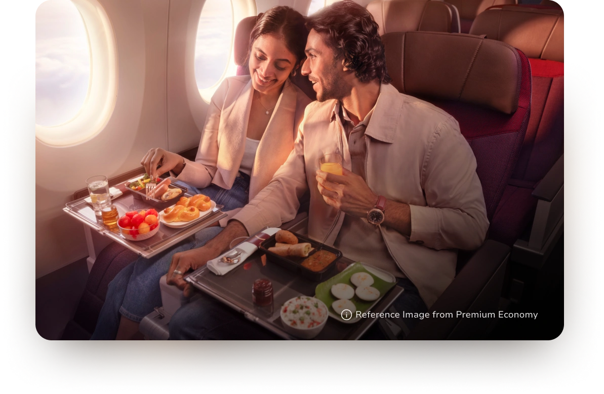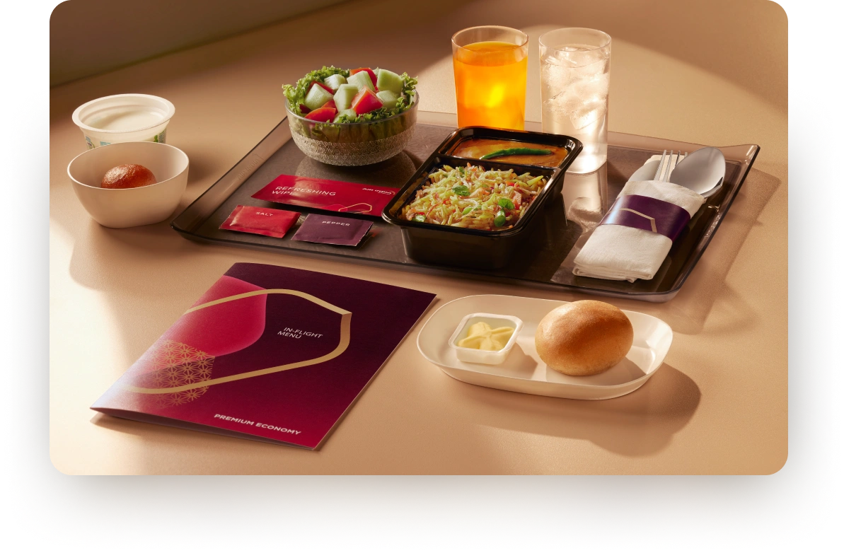 Premium Economy guests are invited on a culinary journey through global classics and Indian gems, artfully sequenced and elegantly served. Enjoy a taste of luxury, at every altitude thoughtfully curated to uplift your onboard experience.