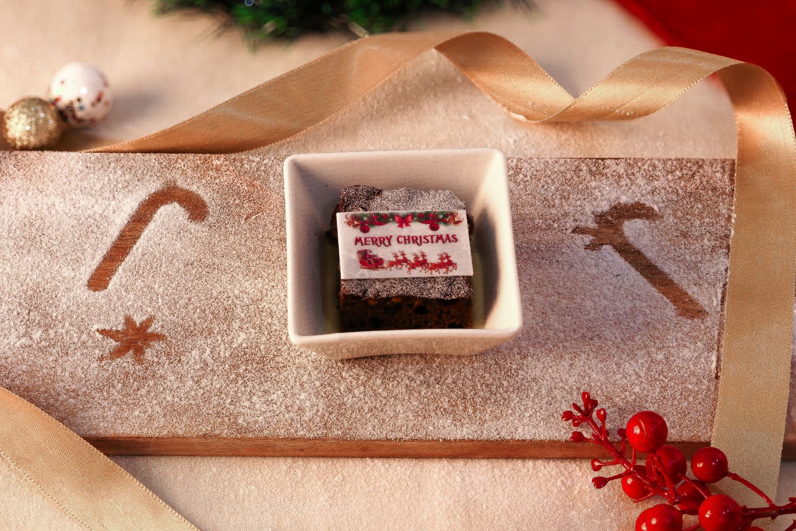 For customers in Premium Economy and Economy cabins, we sweeten the festivities with a traditional Christmas cake topped with custard sauce.