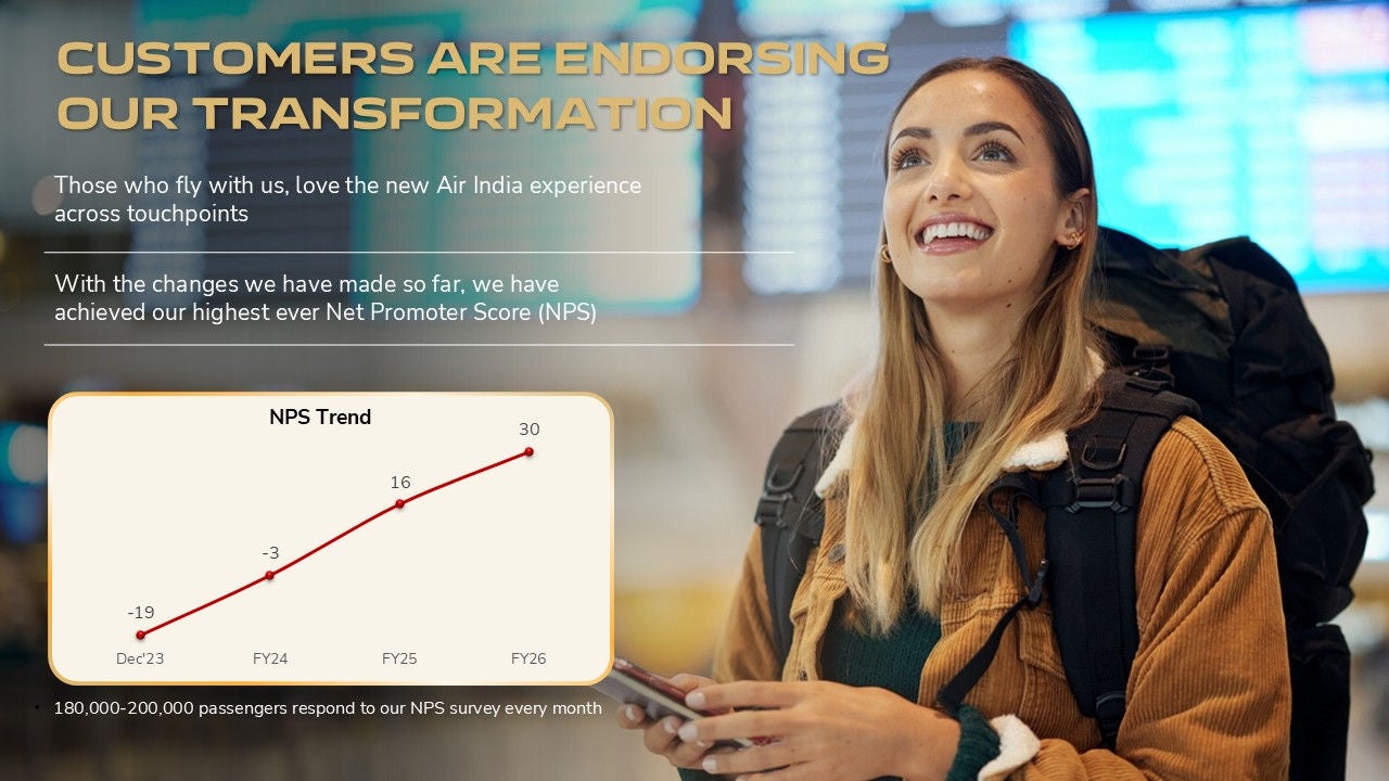 One of the clearest indicators of the impact of these efforts over the last four years has been the marked improvement in customer sentiment. Air India’s Net Promoter Score (NPS) has risen by more than 50 points, from a low of ‑19 in December 2023 to over +30 today, reflecting tangible improvements in the areas that matter most to customers.