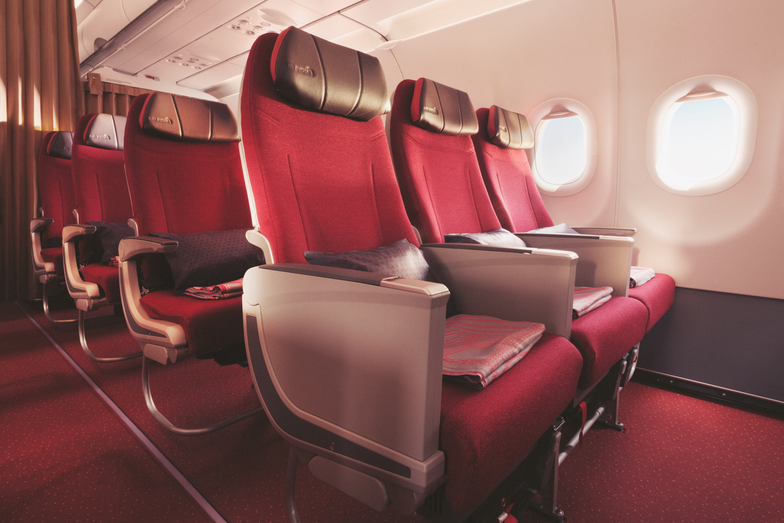 The Economy cabin features 132 ergonomically designed seats set in a 3-3 configuration, with comfortable upholstery, each offering 28-29-inch seat pitch and 4-inch recline, a PED holder, and a coat hook.