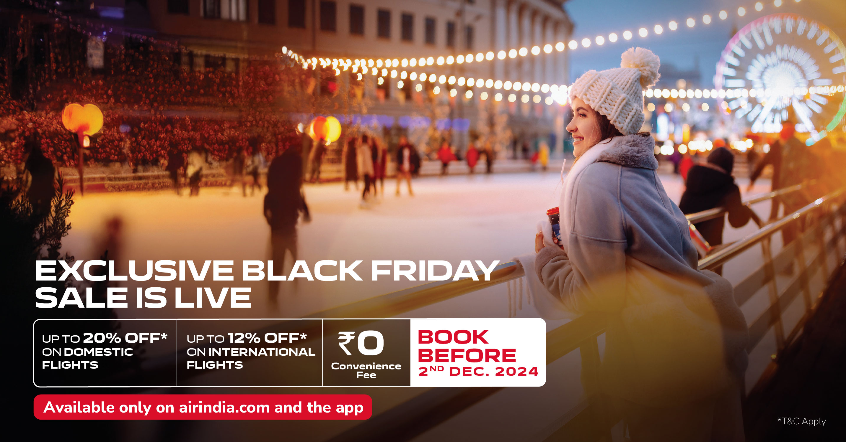 Air India today launched a limited-period, Black Friday Sale, to offer up to 20% off base fares for flights within India, and up to 12% off base fares for flights to or from destinations in the United States, Europe (including the United Kingdom), Australia, Southeast Asia, and South Asia. The sale is exclusively available on Air India’s official website and iOS & Android mobile apps.